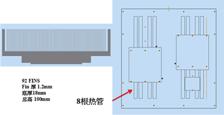 散熱器尺寸為400x380x100mm,熱管布管特定設計;